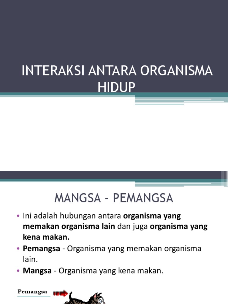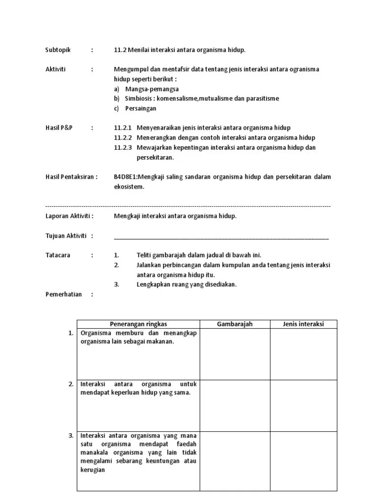 • interaksi antara dua spesies berbeza yang hidup bersama • interaksi antara dua organisma berlainan di mana satu organisma mendapat. Tumbuhan membutuhkan air sebagai bahan baku melangsungkan proses fotosintesis. Documents similar to kepentingan interaksi antara organisma hidup dan persekitaran. Keberadaan tumbuhan di hutan sangat mempengaruhi ketersediaan air. Apabila populasi meningkat dengan pesat, organisma dari spesis yang sama akan bersaing untuk. Interaksi antara komponen biotik dengan abiotik misalnya interaksi antara air dengan tumbuhan. Saling bersandaran antara organisma hidup dengan persekitaran. Menerangkan melalui contoh kebaikan dan keburukan kawalan biologi dalam mengawal bilangan musuh tanaman di kawasan tertentu. Mengekalkan keseimbangan dalam alam sekitar (bilangan dan jenis benda dapat mengekalkan saiz sesuatu populasi dalam ekosistem. Kepentingan interaksi antara organisma hidup & persekitaran. Interaksi dapat terjadi antara komponen hidup (biotik) dengan komponen biotik dan komponen biotik dengan komponen abiotik (benda mati). Semua organisma yang hidup di dalam sesuatu habitat berinteraksi/ bergantung antara satu. Terdapat banyak ekosistem yang berurusan dengan pelbagai organisma dan habitatnya.