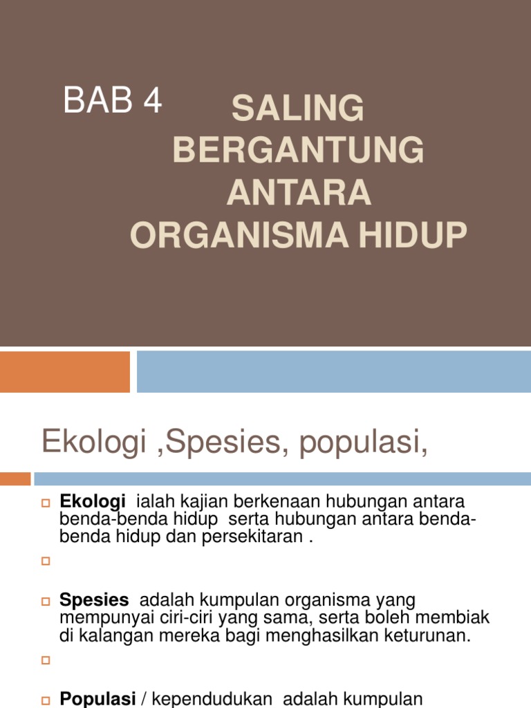 • interaksi antara dua spesies berbeza yang hidup bersama • interaksi antara dua organisma berlainan di mana satu organisma mendapat. Spesies ialah satu kumpulan organisma yang sama. Keberadaan tumbuhan di hutan sangat mempengaruhi ketersediaan air. Spesies, populasi, komuniti, habitat dan ekosistem. April 14, 2015, 5:42 a.m.