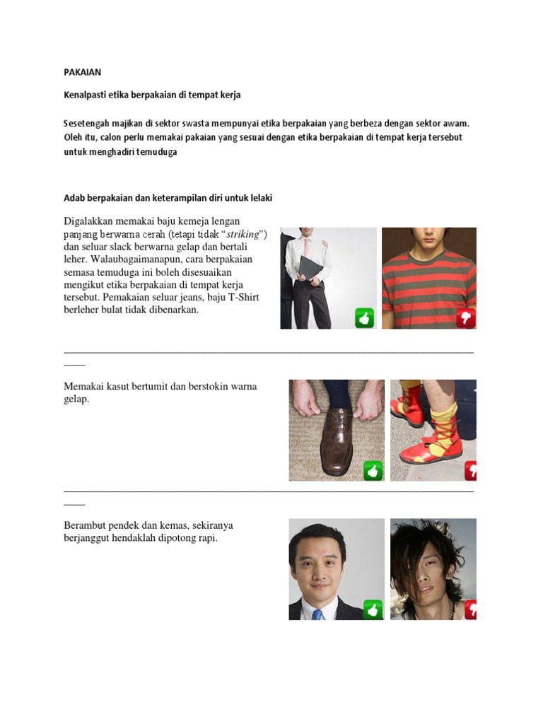 Penampilan yang baik sewaktu temuduga merupakan asas kejayaan yang berpanjangan. Contoh pakaian temuduga kerajaan & swasta 2021 berikut dikongsikan adalah maklumat tentang cara pemakaian ketika temuduga yang terbaik bagi lelaki dan perempuan : Kolar baju juga dilipat dengan kemas dan sekiranya anda perlu memakan tali leher, pastikan corak dan warnanya sederhana sahaja. Tips untuk bentuk badan buah pear : Pakailah tudung yang formal dan warna tidak terlalu menonjol. Sewaktu menghadiri temuduga, anda disarankan supaya tidak memakai lebih dari 5 aksesori. Kemaskan dengan memasukkan hujung baju ke dalam seluar. Ini adalah kerana pakaian yang formal akan menunjukkan diri anda mempunyai disiplin dan juga. Kemaskan baju dengan memasukkan hujung baju ke dalam seluar. Pilih kasut yang sesuai sumber: Manakala, suit (blazer, skirt atau seluar) yang sesuai untuk dipakai adalah yang plain, berjalur ataupun bertekstur halus. Bukan semasa hari temuduga terbuka itu berlangsung. Warna kemeja juga hendaklah warna yang cerah dan lembut.
